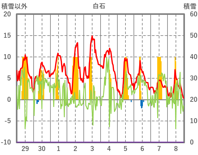 | 日 | 時 | 気温 | 降水 | 風向/風速 | 日照 | 積雪 | 降雪 |