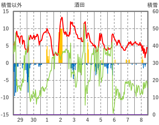 | 日 | 時 | 気温 | 降水 | 風向/風速 | 日照 | 積雪 | 降雪 |