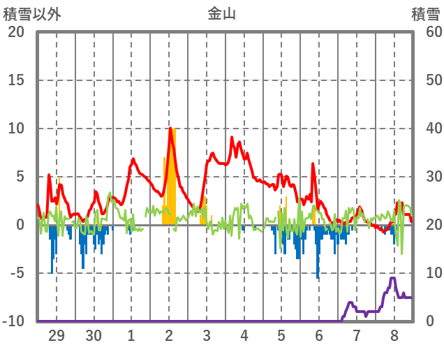 | 日 | 時 | 気温 | 降水 | 風向/風速 | 日照 | 積雪 | 降雪 |