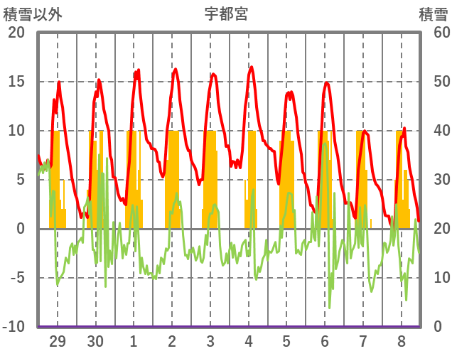 | 日 | 時 | 気温 | 降水 | 風向/風速 | 日照 | 積雪 | 降雪 |