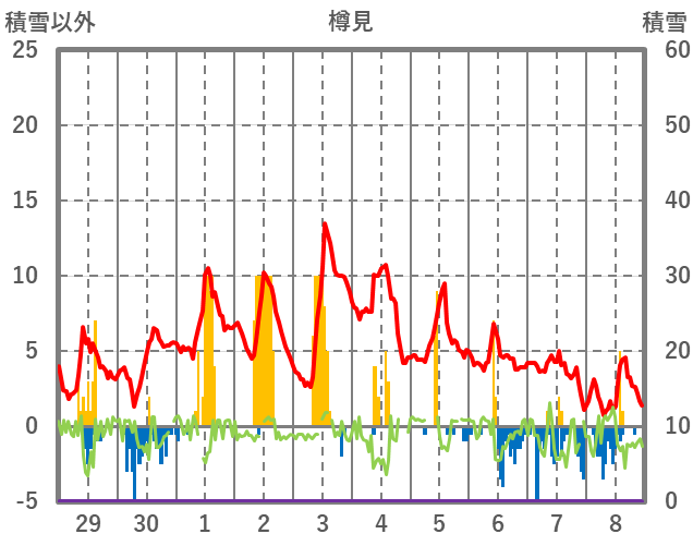 | 日 | 時 | 気温 | 降水 | 風向/風速 | 日照 | 積雪 | 降雪 |