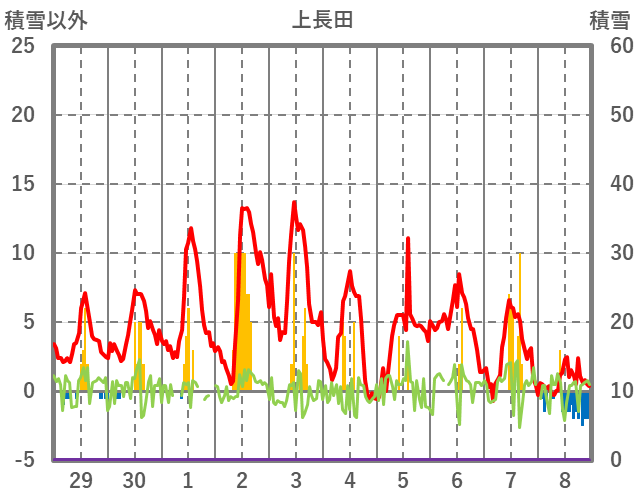 | 日 | 時 | 気温 | 降水 | 風向/風速 | 日照 | 積雪 | 降雪 |