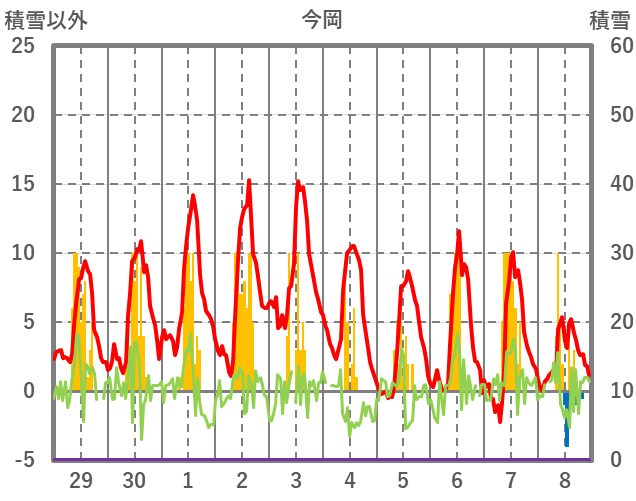 | 日 | 時 | 気温 | 降水 | 風向/風速 | 日照 | 積雪 | 降雪 |