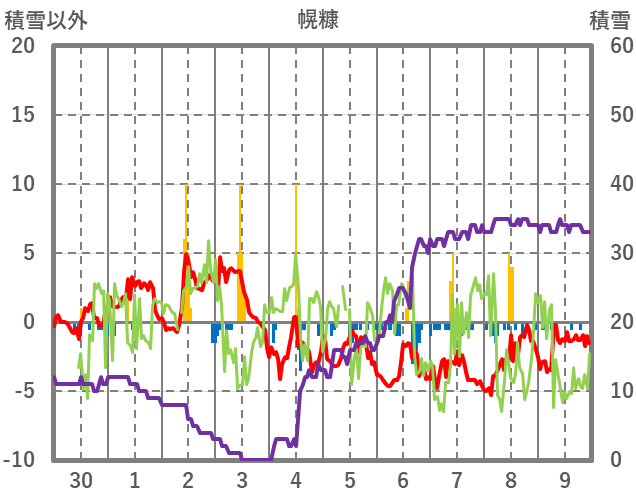 | 日 | 時 | 気温 | 降水 | 風向/風速 | 日照 | 積雪 | 降雪 |