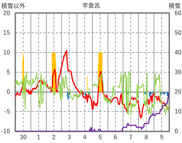 | 日 | 時 | 気温 | 降水 | 風向/風速 | 日照 | 積雪 | 降雪 |