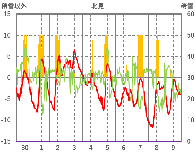 | 日 | 時 | 気温 | 降水 | 風向/風速 | 日照 | 積雪 | 降雪 |