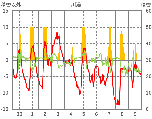 | 日 | 時 | 気温 | 降水 | 風向/風速 | 日照 | 積雪 | 降雪 |