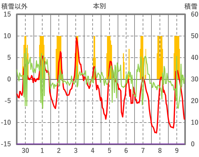 | 日 | 時 | 気温 | 降水 | 風向/風速 | 日照 | 積雪 | 降雪 |