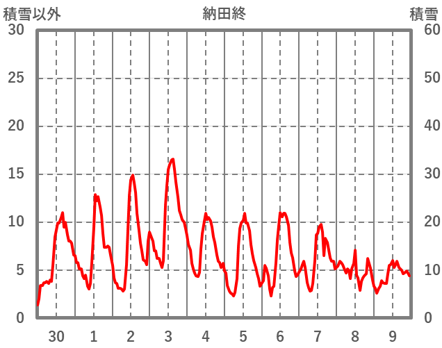| 日 | 時 | 気温 | 降水 | 風向/風速 | 日照 | 積雪 | 降雪 |