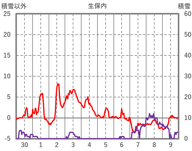 | 日 | 時 | 気温 | 降水 | 風向/風速 | 日照 | 積雪 | 降雪 |