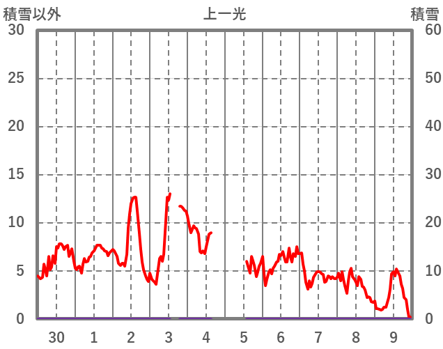 | 日 | 時 | 気温 | 降水 | 風向/風速 | 日照 | 積雪 | 降雪 |