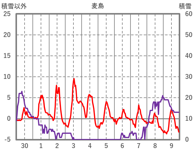 | 日 | 時 | 気温 | 降水 | 風向/風速 | 日照 | 積雪 | 降雪 |
