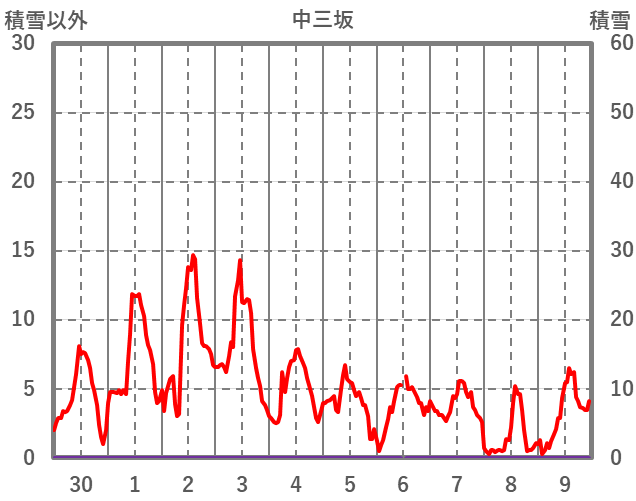 | 日 | 時 | 気温 | 降水 | 風向/風速 | 日照 | 積雪 | 降雪 |