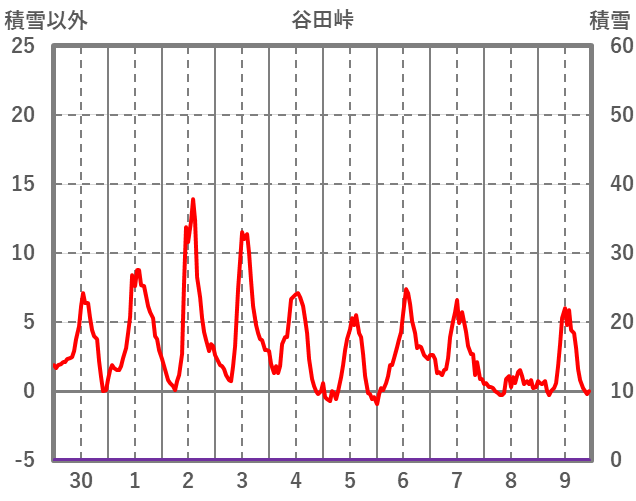| 日 | 時 | 気温 | 降水 | 風向/風速 | 日照 | 積雪 | 降雪 |