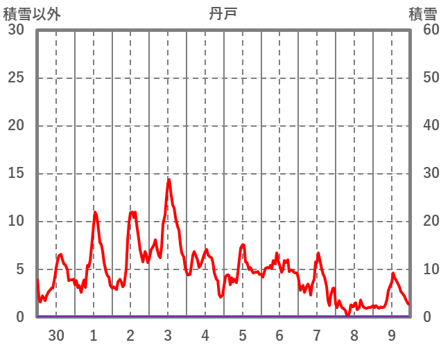 | 日 | 時 | 気温 | 降水 | 風向/風速 | 日照 | 積雪 | 降雪 |