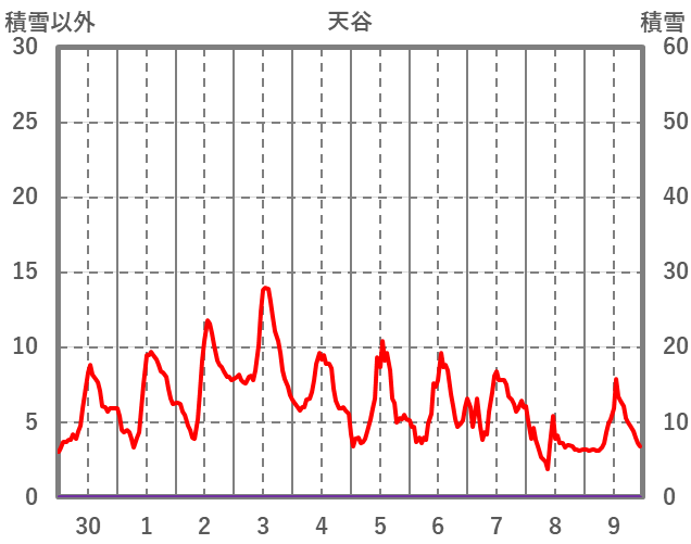 | 日 | 時 | 気温 | 降水 | 風向/風速 | 日照 | 積雪 | 降雪 |