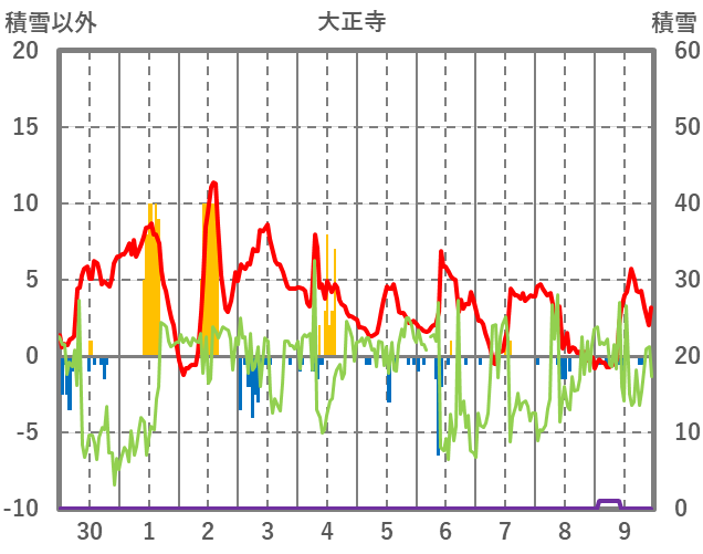 | 日 | 時 | 気温 | 降水 | 風向/風速 | 日照 | 積雪 | 降雪 |