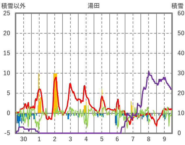 | 日 | 時 | 気温 | 降水 | 風向/風速 | 日照 | 積雪 | 降雪 |