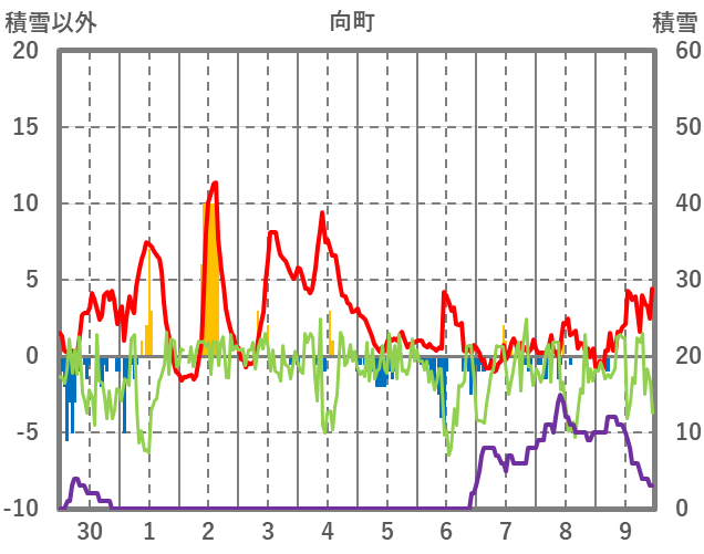 | 日 | 時 | 気温 | 降水 | 風向/風速 | 日照 | 積雪 | 降雪 |