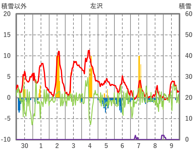 | 日 | 時 | 気温 | 降水 | 風向/風速 | 日照 | 積雪 | 降雪 |