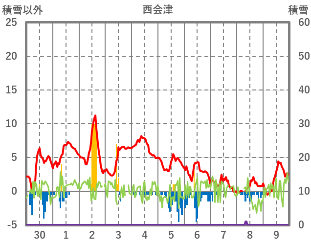 | 日 | 時 | 気温 | 降水 | 風向/風速 | 日照 | 積雪 | 降雪 |