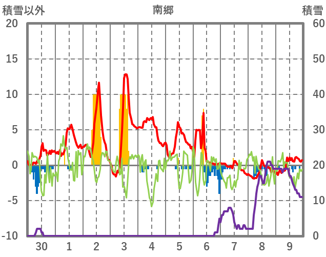 | 日 | 時 | 気温 | 降水 | 風向/風速 | 日照 | 積雪 | 降雪 |