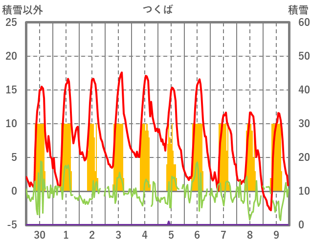 | 日 | 時 | 気温 | 降水 | 風向/風速 | 日照 | 積雪 | 降雪 |
