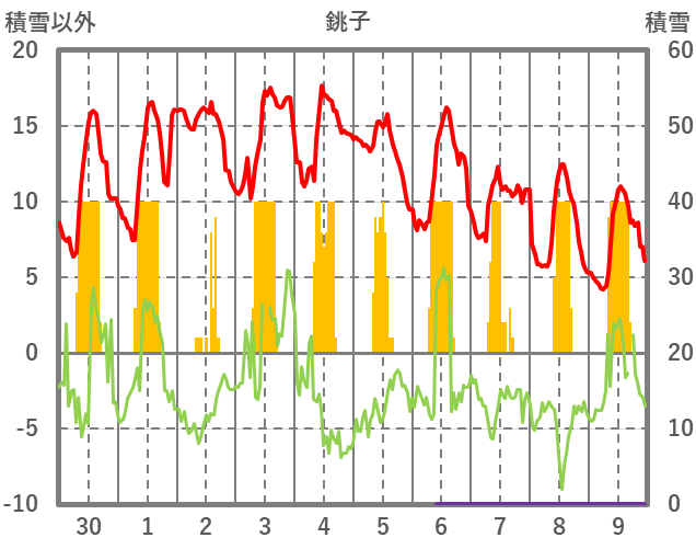 | 日 | 時 | 気温 | 降水 | 風向/風速 | 日照 | 積雪 | 降雪 |