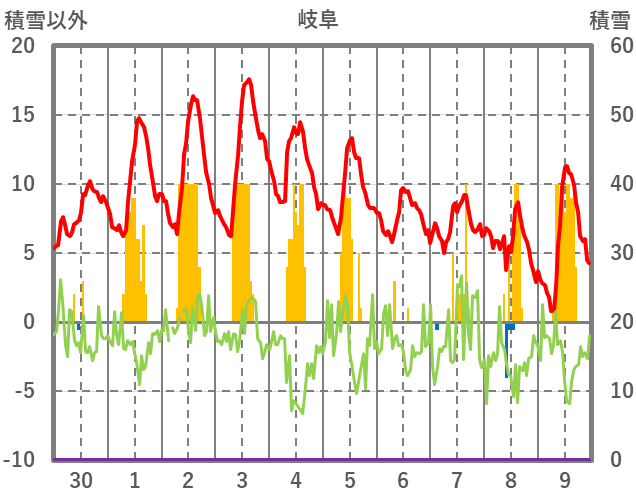 | 日 | 時 | 気温 | 降水 | 風向/風速 | 日照 | 積雪 | 降雪 |