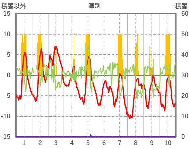 | 日 | 時 | 気温 | 降水 | 風向/風速 | 日照 | 積雪 | 降雪 |