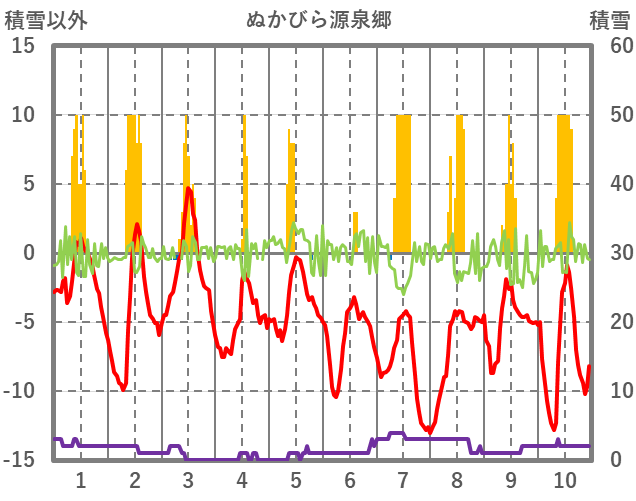 | 日 | 時 | 気温 | 降水 | 風向/風速 | 日照 | 積雪 | 降雪 |