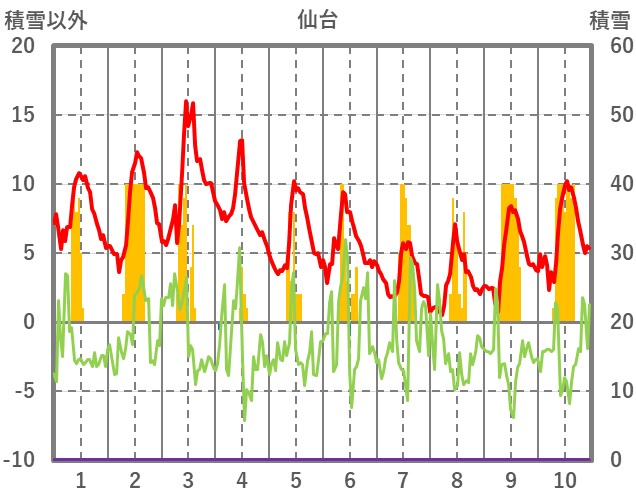| 日 | 時 | 気温 | 降水 | 風向/風速 | 日照 | 積雪 | 降雪 |