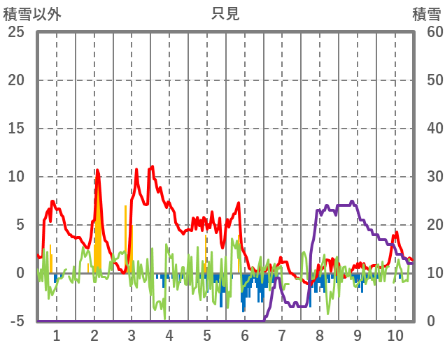 | 日 | 時 | 気温 | 降水 | 風向/風速 | 日照 | 積雪 | 降雪 |