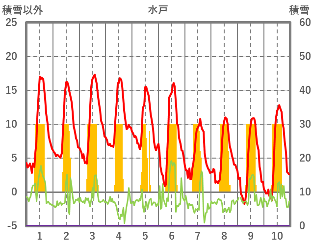 | 日 | 時 | 気温 | 降水 | 風向/風速 | 日照 | 積雪 | 降雪 |