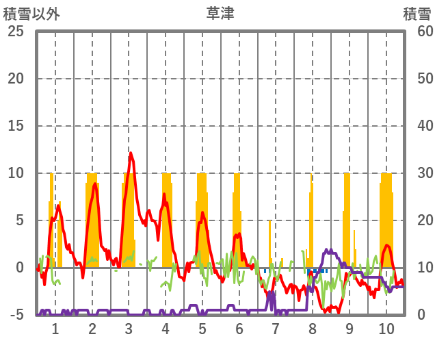 | 日 | 時 | 気温 | 降水 | 風向/風速 | 日照 | 積雪 | 降雪 |