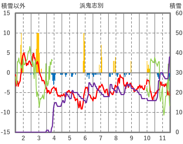| 日 | 時 | 気温 | 降水 | 風向/風速 | 日照 | 積雪 | 降雪 |