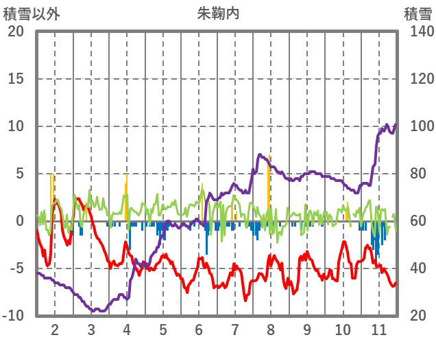 | 日 | 時 | 気温 | 降水 | 風向/風速 | 日照 | 積雪 | 降雪 |