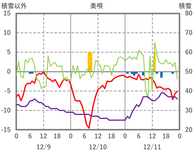 | 日 | 時 | 気温 | 降水 | 風向/風速 | 日照 | 積雪 | 降雪 |