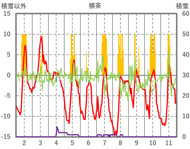 | 日 | 時 | 気温 | 降水 | 風向/風速 | 日照 | 積雪 | 降雪 |