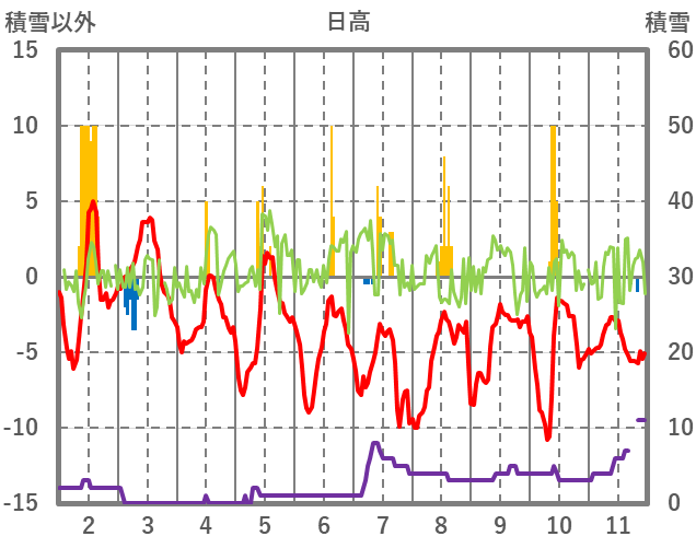| 日 | 時 | 気温 | 降水 | 風向/風速 | 日照 | 積雪 | 降雪 |