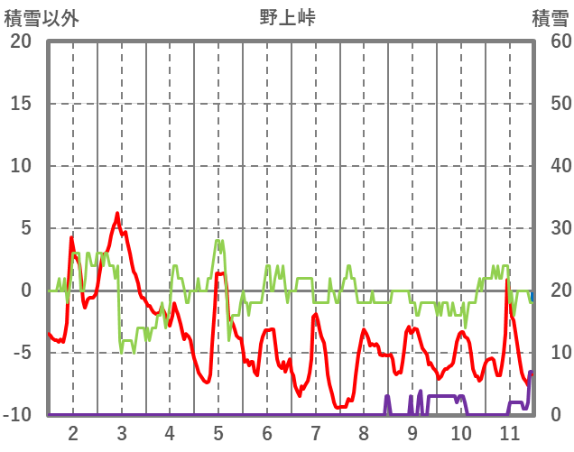 | 日 | 時 | 気温 | 降水 | 風向/風速 | 日照 | 積雪 | 降雪 |