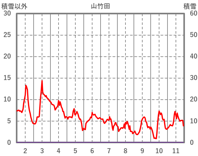 | 日 | 時 | 気温 | 降水 | 風向/風速 | 日照 | 積雪 | 降雪 |