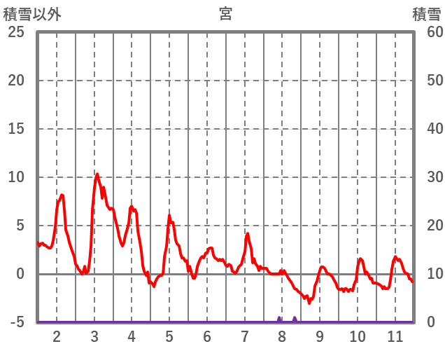 | 日 | 時 | 気温 | 降水 | 風向/風速 | 日照 | 積雪 | 降雪 |