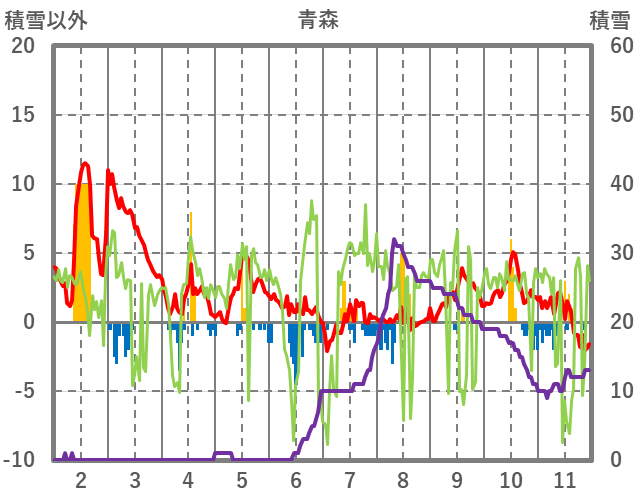 | 日 | 時 | 気温 | 降水 | 風向/風速 | 日照 | 積雪 | 降雪 |