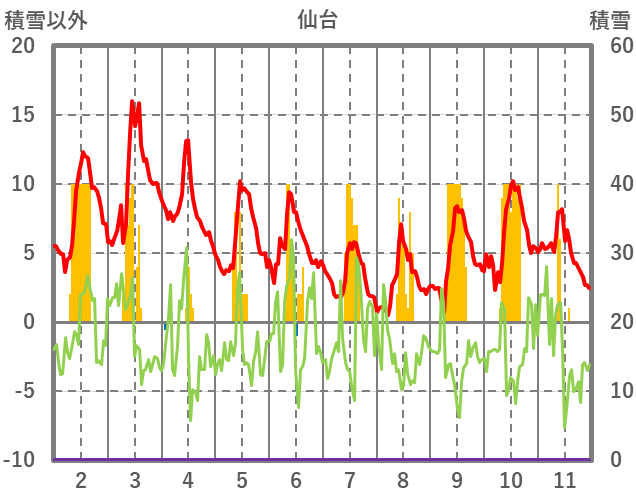 | 日 | 時 | 気温 | 降水 | 風向/風速 | 日照 | 積雪 | 降雪 |