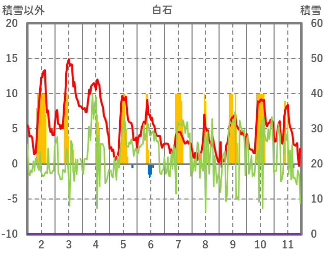 | 日 | 時 | 気温 | 降水 | 風向/風速 | 日照 | 積雪 | 降雪 |