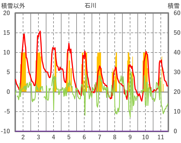 | 日 | 時 | 気温 | 降水 | 風向/風速 | 日照 | 積雪 | 降雪 |