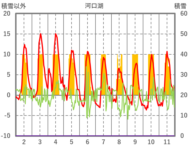 | 日 | 時 | 気温 | 降水 | 風向/風速 | 日照 | 積雪 | 降雪 |