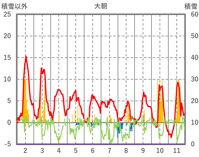 | 日 | 時 | 気温 | 降水 | 風向/風速 | 日照 | 積雪 | 降雪 |