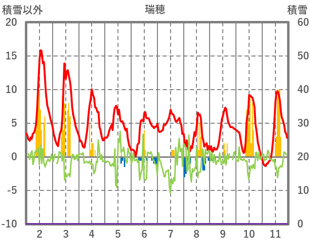 | 日 | 時 | 気温 | 降水 | 風向/風速 | 日照 | 積雪 | 降雪 |